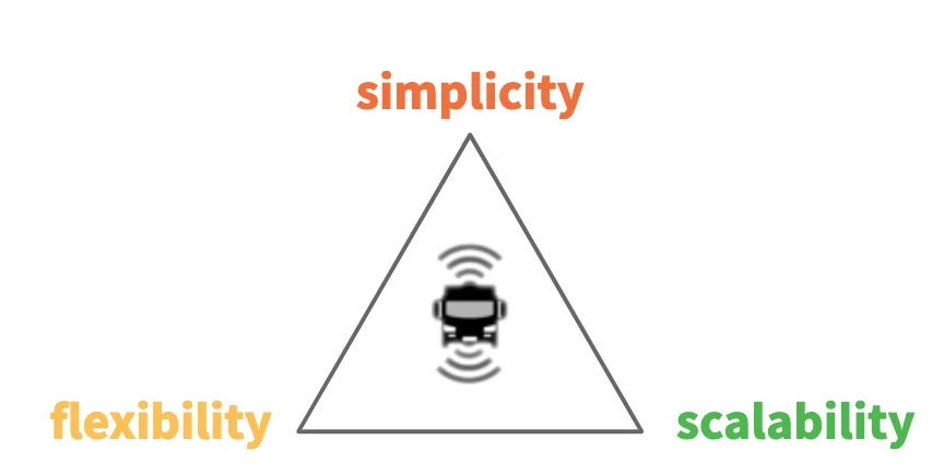 Bevor wir uns Gedanken darüber machten, wie die Norm funktionieren sollte, legten wir einige Leitprinzipien fest. Wir beschlossen, dass die neue Norm einfach, flexibel und skalierbar sein sollte. Natürlich ist es unmöglich, maximale Flexibilität, Einfachheit und Skalierbarkeit gleichzeitig zu erreichen. Diese Abbildung verdeutlicht dies perfekt: