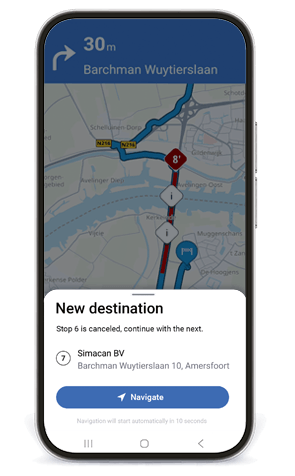 Is de chauffeur reeds onderweg? Dan moet de route worden onderbroken en opnieuw ingesteld. Dat leidt tot extra handelingen in de cabine en onnodige ruis in het proces. Simacan Drive verwerkt stop- en ritwijzigingen rechtstreeks vanuit het platform in de navigatie. Zodra planning iets aanpast, verandert de route automatisch mee. Zo blijven orderafhandeling en routebegeleiding logisch gescheiden, maar volledig op elkaar afgestemd. De chauffeur hoeft niets te herstarten of opnieuw in te voeren en kan zich volledig concentreren op het verkeer. Geen verstoringen, dus veiliger!